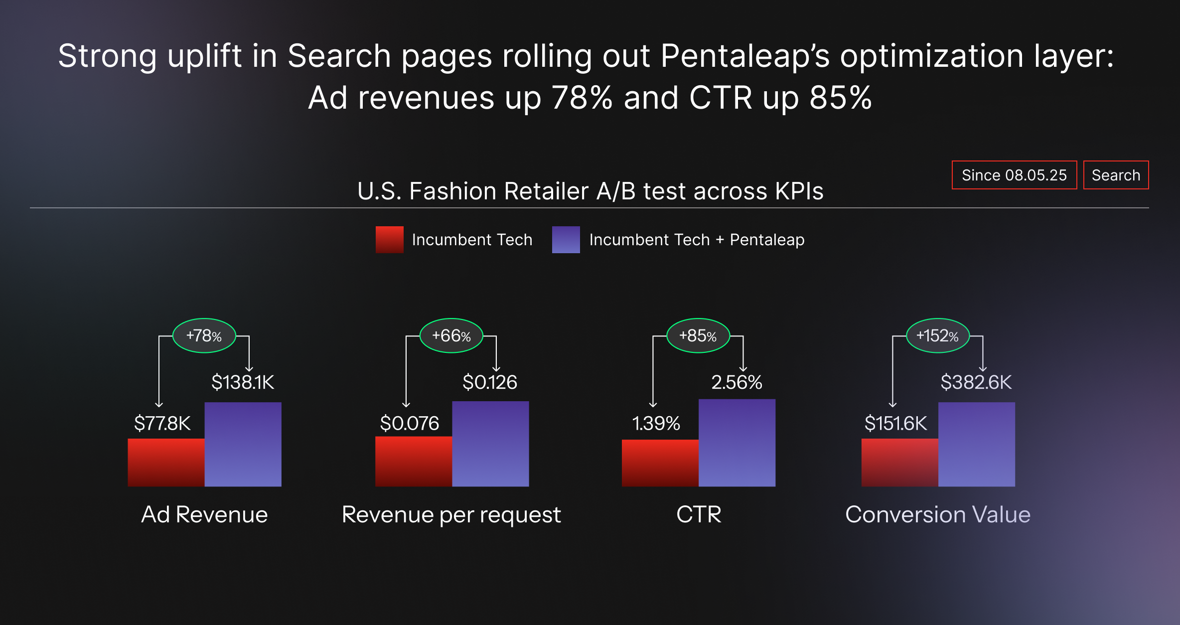 Pentaleap was tested on an additional publisher’s search pages to confirm results held across inventory. Once the test was declared a win [results below], the retailer moved to phase two of the rollout.